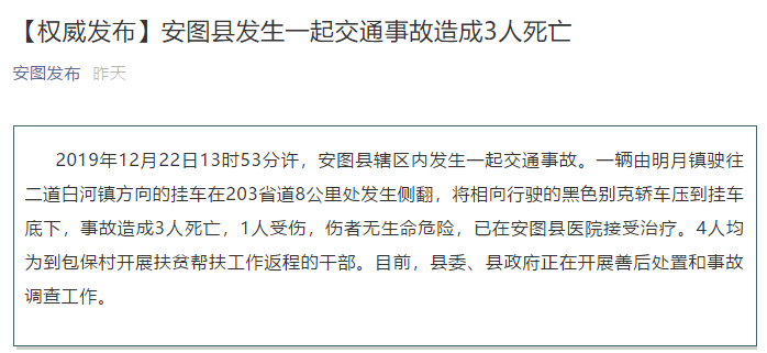 据了解,2019年12月22日13时53分许,吉林省安图县辖区内发生一起交通事故。一辆由明月镇驶往二道白河镇方向的挂车在203省道8公里处发生侧翻,将相向行驶的黑色别克轿车压到挂车底下,事故造成3人死亡,1人受伤,伤者无生命危险,已在安图县医院接受治疗。4人均为到包保村开展扶贫帮扶工作返程的干部。