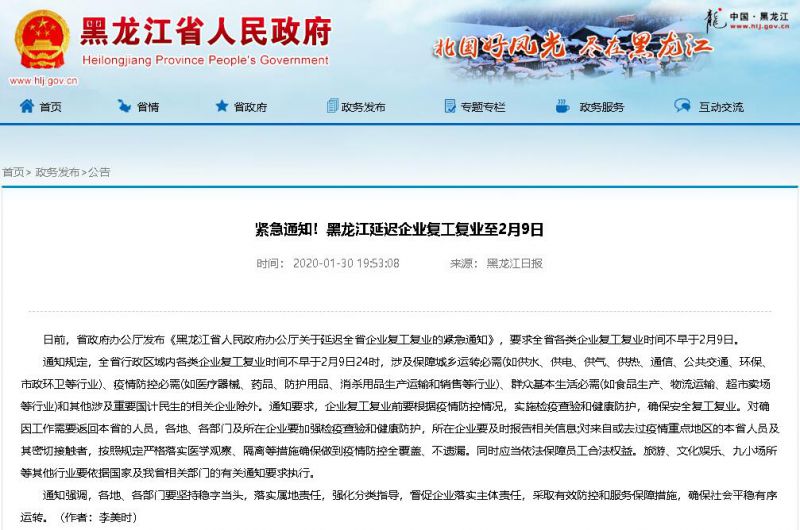 原标题:紧急通知!黑龙江延迟企业复工复业至2月9日