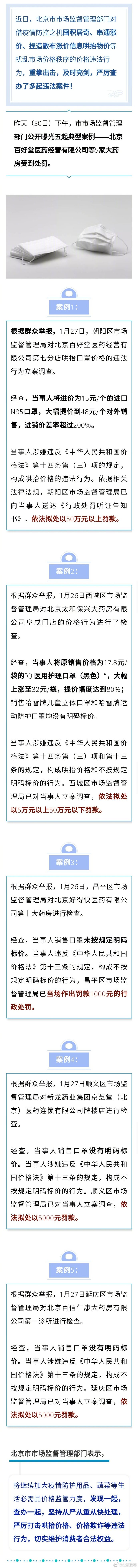 【15元的口罩卖48元,北京“百好堂”等五家药店全被罚!】近日,北京市市场监督管理部门对借疫情防控之机囤积居奇、串通涨价、捏造散布涨价信息哄抬物价等扰乱市场价格秩序的价格违法行为,重拳出击,及时亮剑,严厉查办了多起违法案件!昨天(30日)下午,市市场监督管理部门公开曝光五起典型案例——北京百好堂医药经营有限公司等5家大药房受到处罚。