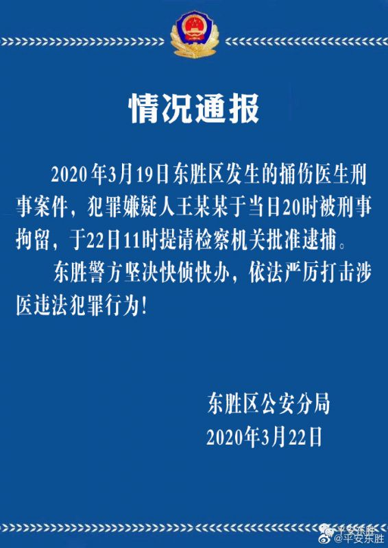 内蒙古鄂尔多斯市公安局东胜区分局22日通报称,2020年3月19日东胜区发生的捅伤医生刑事案件,犯罪嫌疑人王某某于当日20时被刑事拘留,于22日11时提请检察机关批准逮捕。