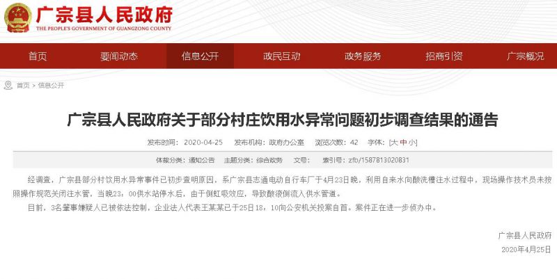 全民公众讯 据广宗县人民政府网站消息,广宗县人民政府关于部分村庄饮用水异常问题初步调查结果的通告。经调查,广宗县部分村饮用水异常事件已初步查明原因,系广宗县志通电动自行车厂于4月23日晚,利用自来水向酸洗槽注水过程中,现场操作技术员未按照操作规范关闭注水管,当晚23:00供水站停水后,由于倒虹吸效应,导致酸液倒流入供水管道。