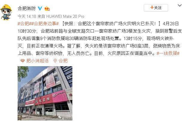 全民公众讯 据安徽省合肥市消防救援支队官方微博消息,4月28日10时30分,合肥站前路与全椒支路交口一窗帘家纺广场3楼发生火灾,接到报警后支队先后调集9个消防救援站30辆消防车赶赴现场处置。13时15分,现场明火被扑灭,目前正在清理火场。据了解,失火的是该窗帘家纺广场B座3层,燃烧物质为床上用品、窗帘等纺织物,无人员伤亡。