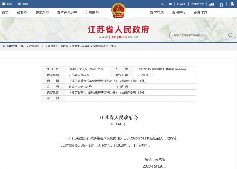 全民公众讯 近日,《江苏省重大行政决策程序实施办法》(以下简称《办法》)经江苏省政府常务会议讨论通过,自2020年8月1日起施行。《办法》对重大行政决策的全过程进行规范指导,并规定决策机关违反规定造成决策严重失误,造成重大损失、恶劣影响的,应当倒查责任,实行终身责任追究。