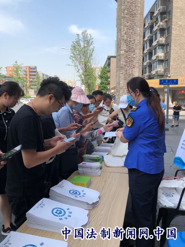 工作人员现场向市民发放《中华人民共和国水污染防治法》、《中华人民共和国大气污染防治法》、《中华人民共和国土壤污染防治法》《四川省环境保护条例》,《成都市建筑垃圾处置管理条例实施办法》,《成都市家庭生活垃圾分类指引》,《成都市容和环境卫生管理条例》,《排污许可管理办法(试行)》等法律法规单行本作为宣传资料。