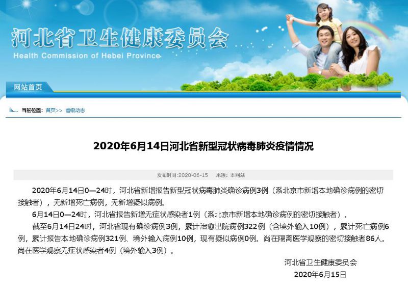 今天上午,河北省卫健委通报:2020年6月14日0—24时,河北省新增报告新型冠状病毒肺炎确诊病例3例(系北京市6月11日新增本地确诊病例的密切接触者),新增无症状感染者1例(系北京市6月11日新增本地确诊病例的密切接触者)。3例确诊病例及1例无症状感染者为一家人。