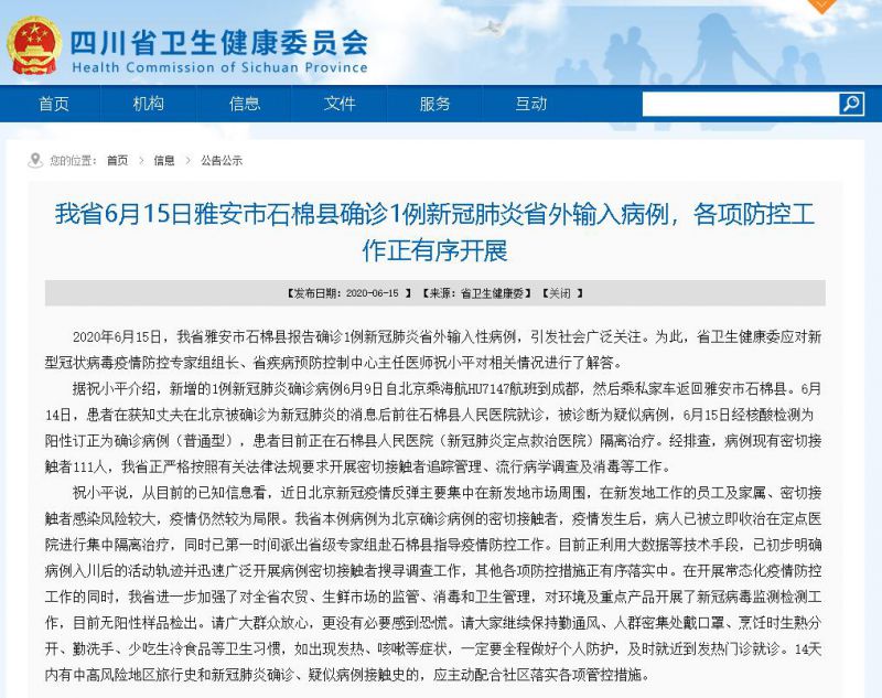 全民公众讯 6月15日,四川省卫生健康委网站发布消息,2020年6月15日,我省雅安市石棉县报告确诊1例新冠肺炎省外输入性病例,引发社会广泛关注。为此,省卫生健康委应对新型冠状病毒疫情防控专家组组长、省疾病预防控制中心主任医师祝小平对相关情况进行了解答。