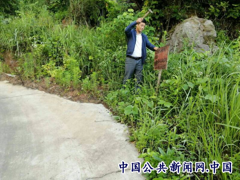 燕子乡双全村“村级路长”张丕文正在树道路临时警示牌