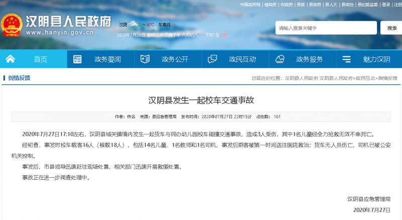 2020年7月27日17:10左右,汉阴县城关镇境内发生一起货车与民办幼儿园校车碰撞交通事故,造成3人受伤,其中1名儿童经全力抢救无效不幸死亡。