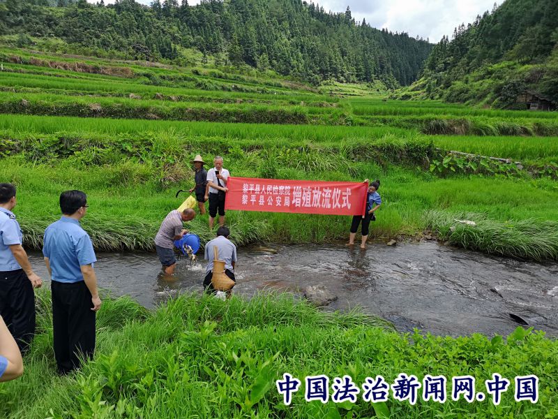 全民公众讯(熊 卫)近日,黎平县人民检察院联合县人民法院、县公安局、县农业农村局在黎平县岩洞镇竹坪村“斑嘛”河段开展公益诉讼案件生态补偿增殖放流活动。